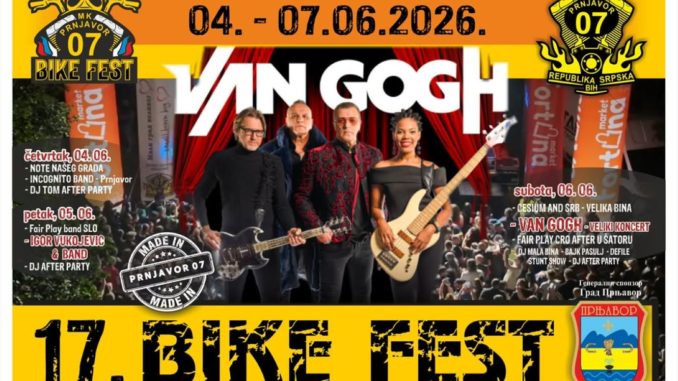 Na velikoj bini prvo će nastupiti grupa Cesium iz Velike Plane, dok će u 22.00 časa pred publiku izaći legendarni Van Gogh. Bend koji iza sebe ima četiri decenije rada, bezbroj hitova i hiljade koncerata širom Evrope, sasvim sigurno predstavlja jedan od najvećih razloga da ljubitelji rock muzike upravo u subotu budu dio prnjavorskog Bike Festa.