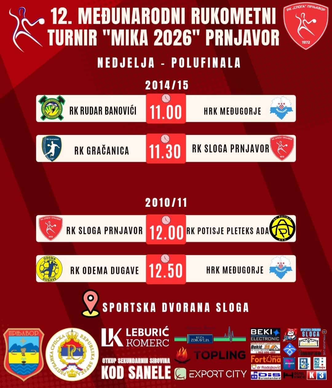 12. Međunarodni rukometni turnir “Mika 2026” stigao je do finalnog dana. Nakon velike borbe u grupnoj fazi, gdje je odigrano ukupno 35 utakmica dobili smo polufinaliste u obe kategorije.