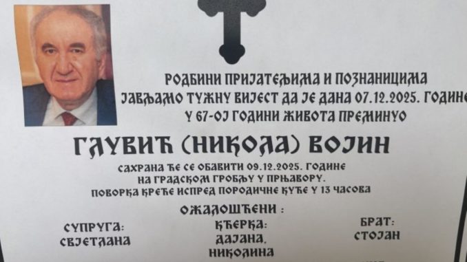 Sahrana će biti obavljena 09.12. na gradskom groblju u Prnjavoru.