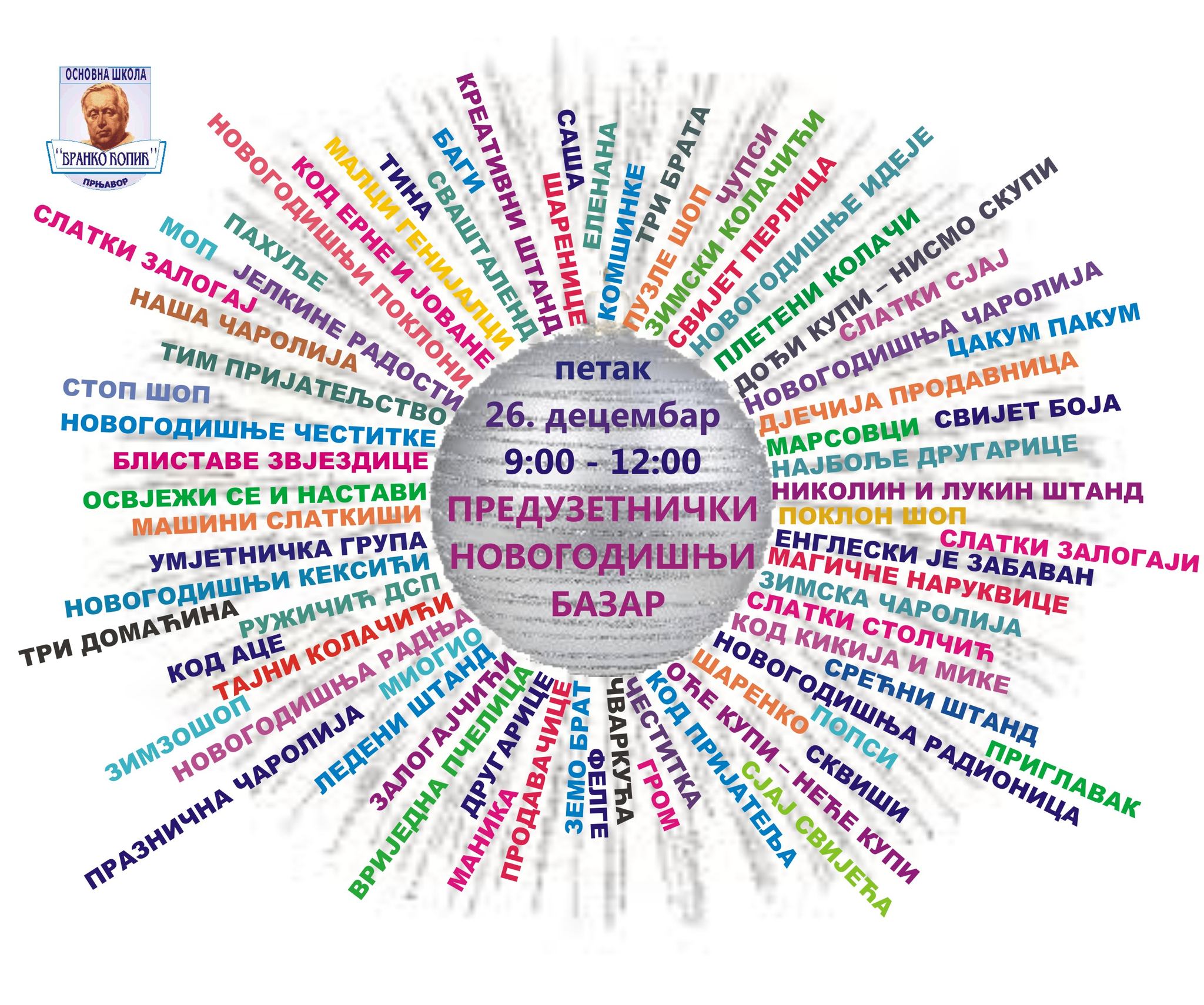 Ove školske godine u OŠ „Branko Ćopić“ Prnjavor odlučili smo da, u cilju razvoja preduzetničkih kompetencija, za Novogodišnji bazar pozovemo učenike da se prijave sa svojim idejama. Bazar kod učenika razvija funkcionalna znanja jer su njihovi zadaci da osmisle naziv preduzeća, vrstu proizvoda, količinu i cijene.