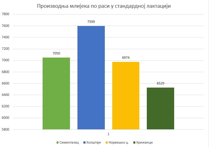 Posebno je interesantna dobra proizvodnja kod simentalca, koja je premašila cilj iz uzgojnog programa Udruženja koji je bio 5.800 litara. Kao što je i očekivano najveća proizvodnost mlijeka je kod rase holštajn i iznosi 7.599 kg mlijeka u standardnoj laktaciji. Slijedi simentalac sa 7.050 kg mlijeka, te norveško crveno goveče sa 6.974 kg mlijeka u standardnoj laktaciji. U kontroli proizvodnosti bio je jedan broj križanaca, kod kojih je prosječna proizvodnja bila 6.529 kg mlijeka u standardnoj laktaciji (15 grla).