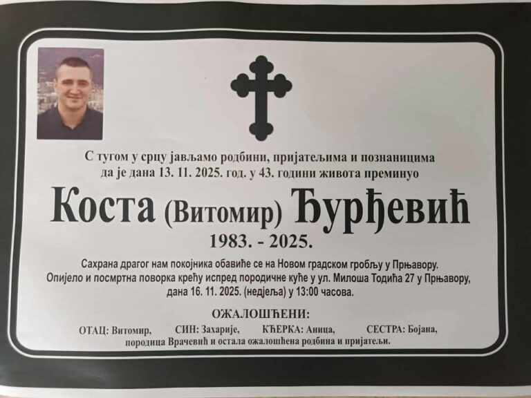 Opijelo i posmrtna povorka kreću ispred porodične kuće u ul. Miloša Todića 27 u Prnjavoru, dana 16.11.2025. (nedjelja) u 13:00 časova.